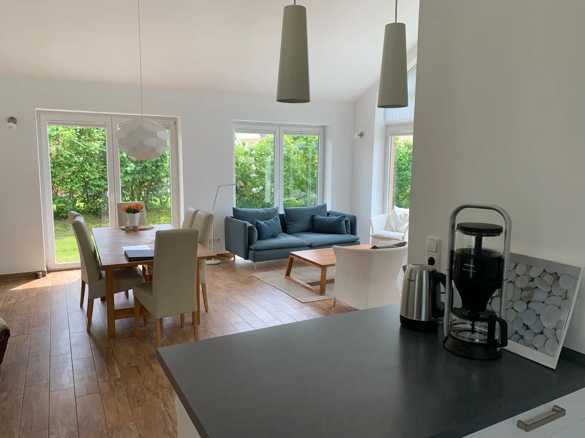 Mit seinen hohen Decken und viel Glas hat es eine helle, offene Atmosphäre, die durch die skandinavische Einrichtung unterstrichen wird. Eine gemütliche Sofaecke lädt ein zum Relaxen, der große Esstisch mit bequemen Polsterstühlen hat Platz für eine große Familie oder viele Freunde. Im Seefahrerhaus darf darüber hinaus auch der Familienhund zu Gast sein.